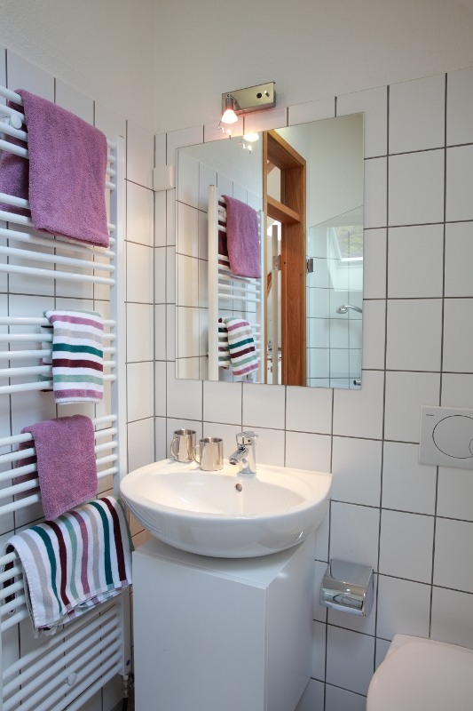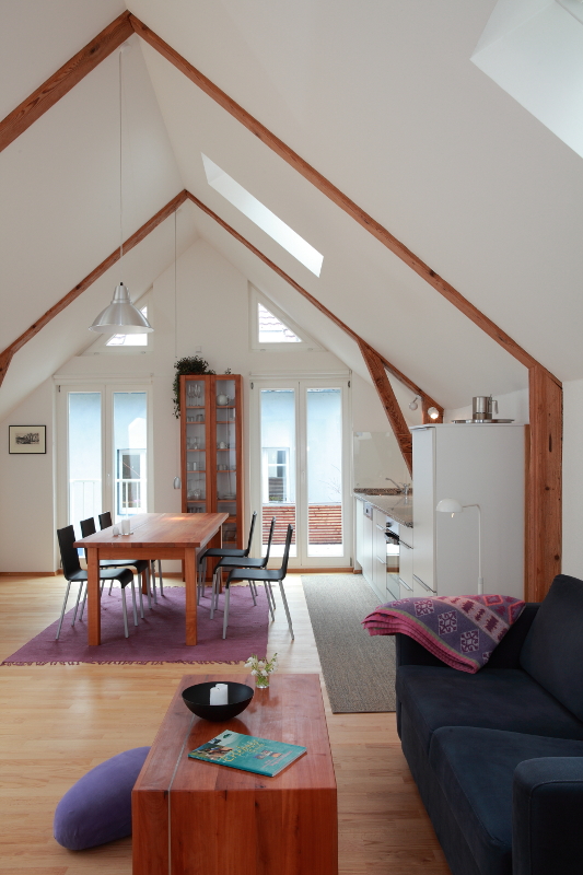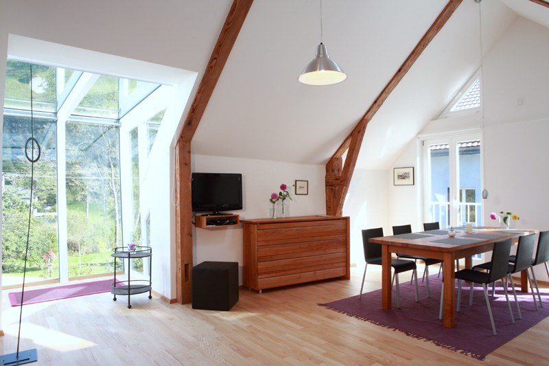 L'Appartement Violet, avec ses 65 m², occupe les deux étages supérieurs de la Maison de l'Eau.Il est impressionnant avec ses plafonds hauts et sa cloison en verre oblique au milieu de la pièce de séjour.