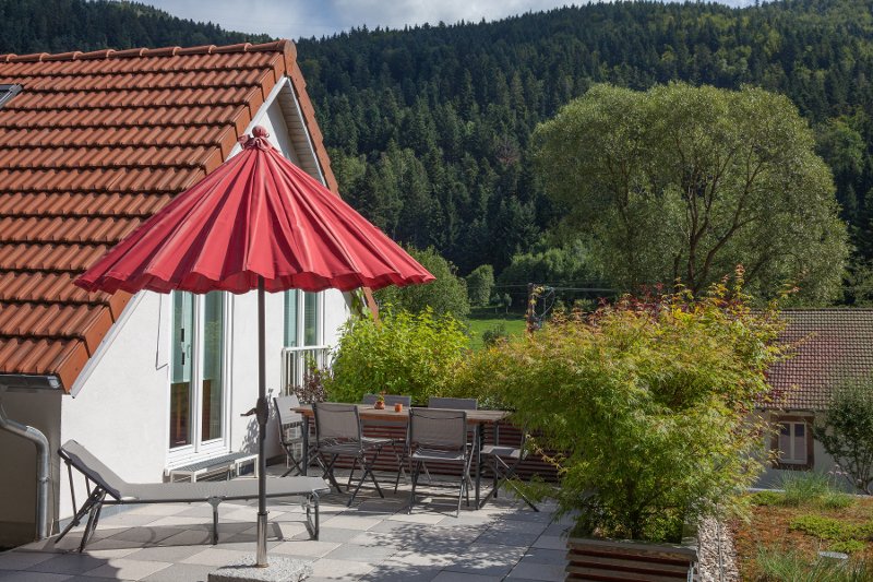 Une terrasse avec ses meubles assortis invite à manger ou à prendre le café dehors, surtout pendant la saison chaude.